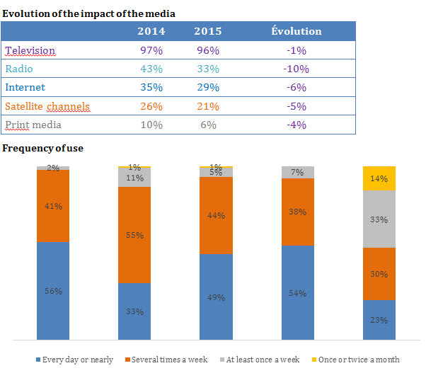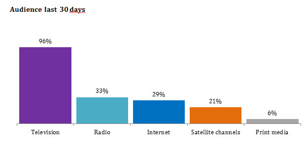 In this period of start of new school year, the market research agency, Target SARL is releasing secrets of research on statistic of media 2015 for Kinshasa city. In this 3rd edition, classical television still remains the most followed media by Kinshasa inhabitants with a large audience of 96%. Radio is less followed compared with last year (-10%) yet holds its second position with 33%. It is followed by internet (29%), satellite channels (21%) and print media (6%).