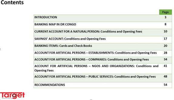 Nowadays, banking sector in DR Congo is a field of competition between about fifteen banks operating in almost all provinces of DR Congo. This leads to a diversity of choice as well for private persons as for artificial persons (establishments, companies and public services).