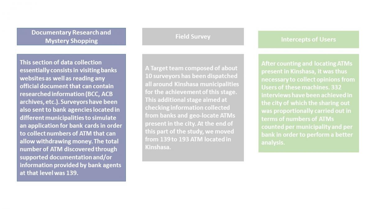 Data collection was performed in August 2018 and combined several techniques: Documentary research, Mystery shopping, field survey and intercepts. The first three were used for counting of ATM and the forth allowed collecting opinions from users of these machines. It is appropriate to indicate that numbers of ATM mentioned in banks’ websites don’t really match with the numbers of ATM found out in the field.