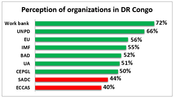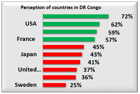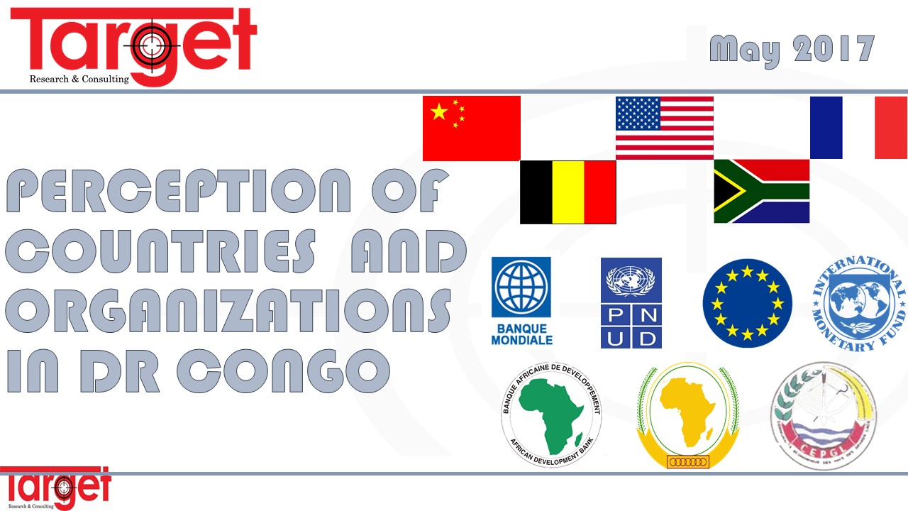 In 2013, Target agency conducted a research related to perception of countries and international organizations operating in Democratic Republic of Congo in 6 main cities of DR Congo (Kinshasa, Matadi, Kisangani, Mbuji-Mayi, Lubumbashi and Goma). And from this research, it resulted that USA and France were perceived as the best partners of DR Congo, mainly in fields of support of democracy, good governance/fight against bribery, justice and human rights as well as gender. In terms of international organizations, despite weak rates of responses from population, the following organizations were considered as the best partners of DR Congo: UNICEF (education), WHO (health), WFP (Food Support) and MONUSCO (support to democracy).