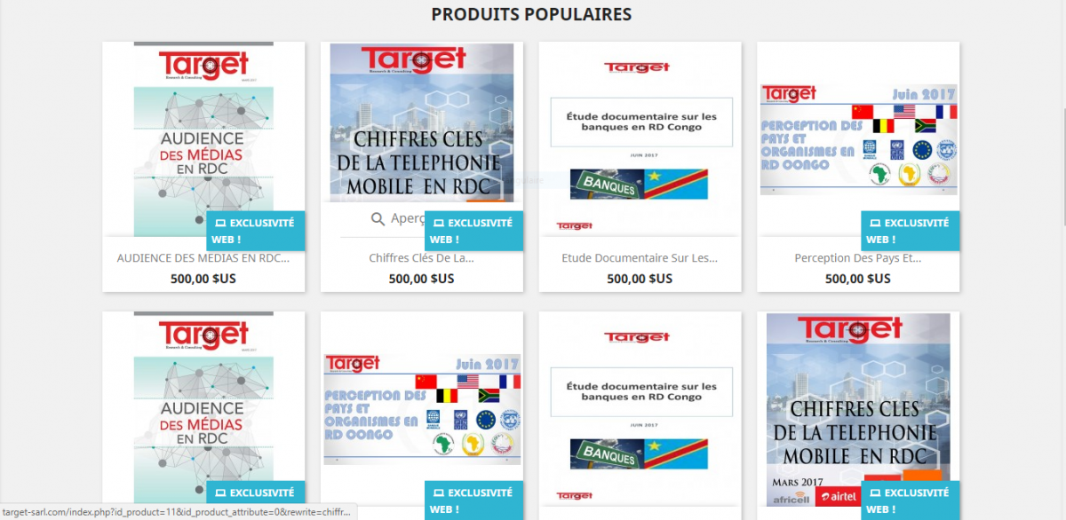 http://target-sarl.com is all about various publications done by Target Sarl. One can also find there section on media entailing all media audience studies conducted in DRC, a section on mobile telecoms for the various editions on key figures on mobile telecom in DRC, another one is on internet entailing Congolese internet users attitudes and behaviour, etc.