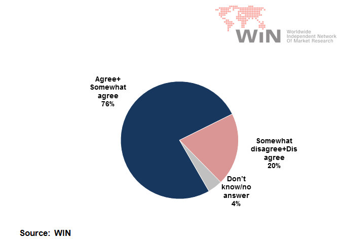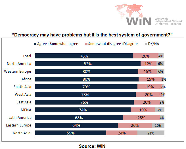 WIN, the world’s leading association in market research and polling, has published on November 19th an opinion poll on democracy in the world - 60,190 people were interviewed in 62 countries across the globe. The world population shows a high degree of acceptance for democracy: 76% believe that democracy may have problems but it is the best system of government. There is consensus all over the world.