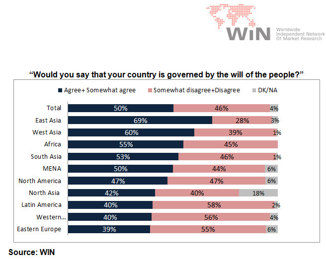 Citizens were also asked whether their country is governed by the will of the people, 50% of those surveyed agree or somewhat agree, while 46% disagree or somewhat disagree. There are differences between the regions of the world, as seen in the following chart.