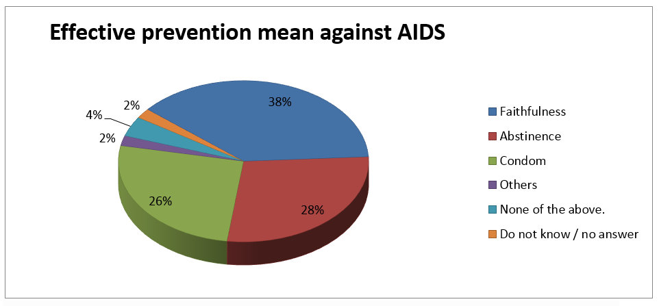 In terms of prevention means, faithfulness holds for 38% of people as the most effective mean of prevention. It is followed by abstinence 28% and the use of condoms 26%.