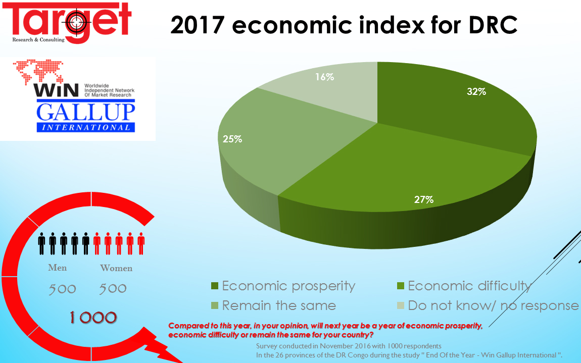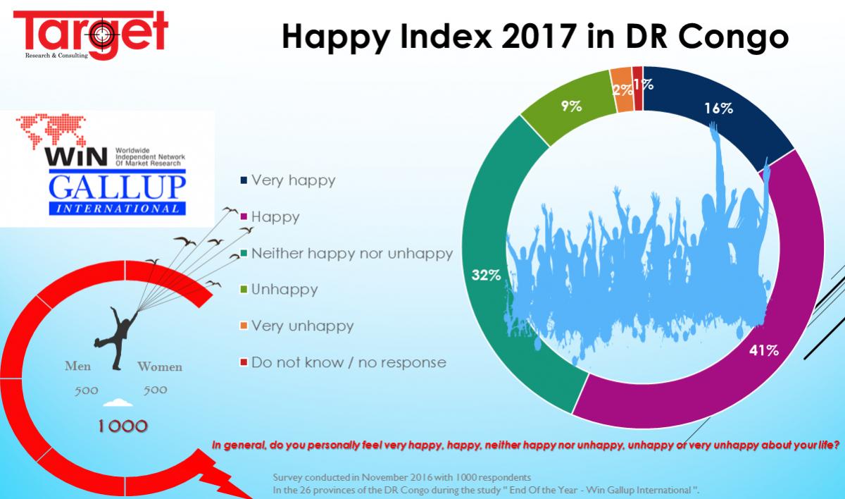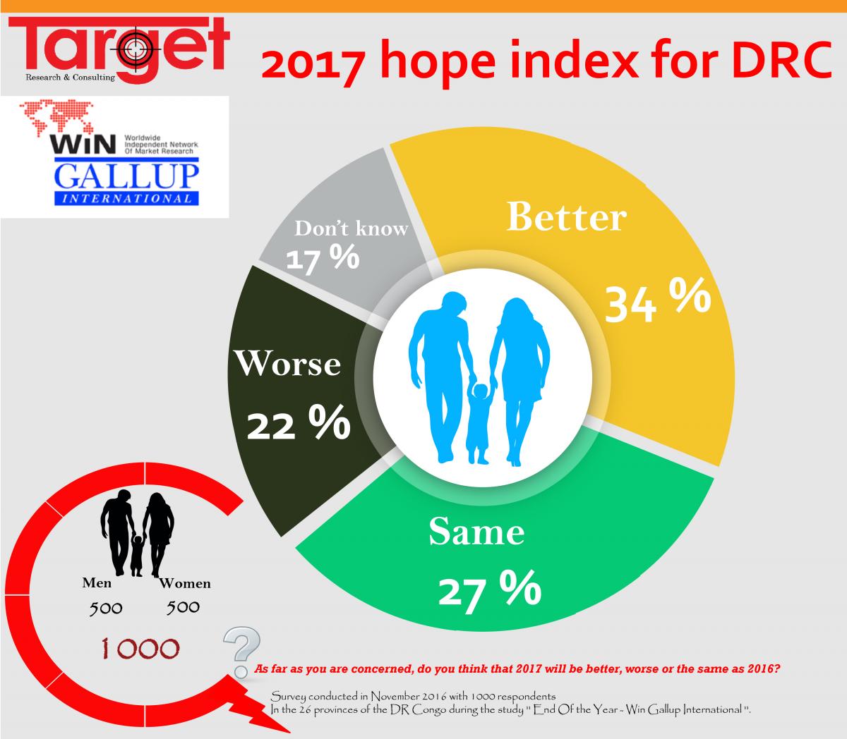 The survey ruled by Target in DRC took place in one principal city and one rural city of each 26 provinces. 1000 Congolese people of which 500 men and 500 women participated in the study. They have been selected by the quotas method by age, sex, occupation and Residence Township. According to the last survey, there is a net regress of optimism in the Congolese. By the way, 35% of respondents think 2017 will be better than 2016 while 22% think it is going to be worst. But they were 44% to be optimist for 2016 with only 15 % of pessimists. It is to remark the same tendency on the economic situation with only 32% of Congolese thinking 2017 will be a year of economic prosperity against 41% for 2016; 27 % estimate this year is going to be economically hard against only 16 % in 2016. In spite of this optimism regress, 57% of DRC population say they are happy, an accrual number (+8 %) compared to the last Win Gallup End of the Year survey.