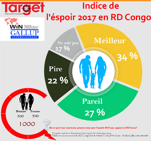 Selon les résultats de l’enquête menée en RDC, 34% pensent que l’année 2017 sera meilleure que l’année passée et 22% sont d’avis que 2017 sera pire. Alors que 46% étaient optimistes pour 2016 contre 15% de pessimistes. Il y a plus d'optimisme à Kinshasa (50%), au Katanga (48%) et au Kivu (46%) pour l'année 2017 contrairement au Bandundu (8%). Ces sont plus les jeunes de 18 à 24 ans, les étudiants, les personnes au revenu moyen et élevé qui sont les plus optimistes pour 2017.