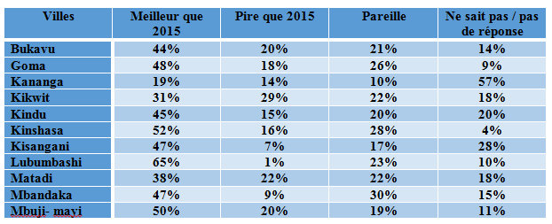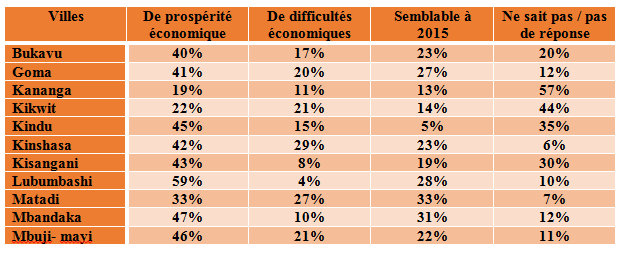 La lecture des résultats par ville montre que 3 villes croient en 2016, Lubumbashi (65%), Kinshasa (52%) et Mbuji- Mayi (50%) tandis que 19% seulement des habitants de Kananga (le score le plus bas) pensent que 2016 sera meilleur que 2015. Sur le plan économique, à Lubumbashi 59% des gens pensent que 2016 sera une année de prospérité économique. Toutes les autres villes sont en dessous de 50%. Encore une fois Kananga enregistre le taux le plus bas (19%).