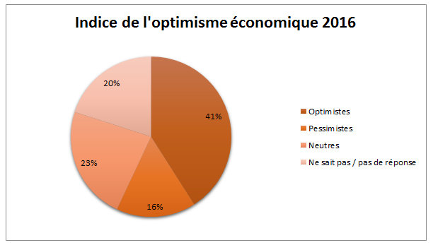 L'étude montre que 45% du monde est optimiste pour les perspectives économiques en 2016 plus du double (22%) de ceux qui sont pessimistes. La Grèce avec -65% est le pays le plus pessimiste compte tenu de sa situation financière périlleuse actuelle. La nation la plus optimiste sur les perspectives économiques est le Nigeria (optimisme net de 61%).