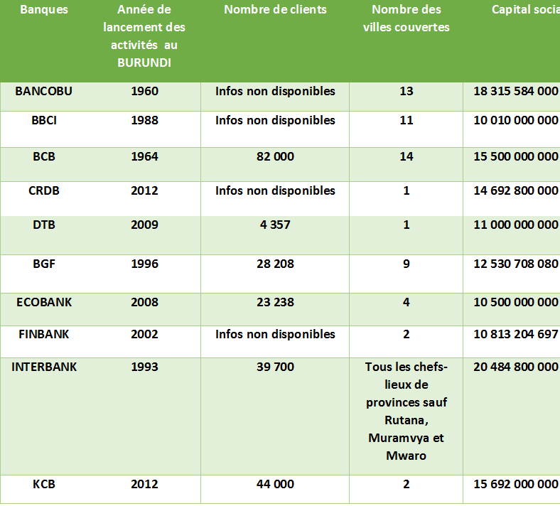 Le secteur bancaire Burundais connait d’énormes défis surtout liés à la situation politico-économique et sociale actuelle. Cet état des choses ne favorise pas une inclusion financière. L’économie du Burundi avait payé un lourd tribut après plusieurs années de guerre civile. Ce n’est qu’après les Accords d’Arusha en 2000 que la croissance économique a été progressive. Cette économie tournée largement vers l’agriculture qui représentait 43.5% du PIB et environ 90% des emplois en 2008, les effets immédiats de la crise financière sur le secteur financier du Burundi ont été très limités.