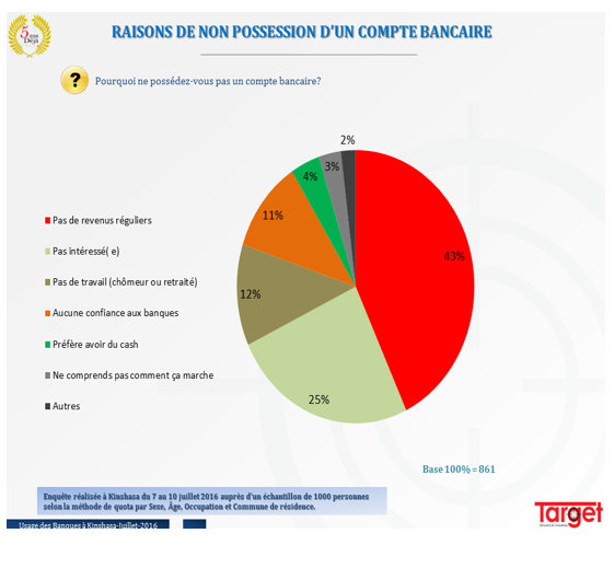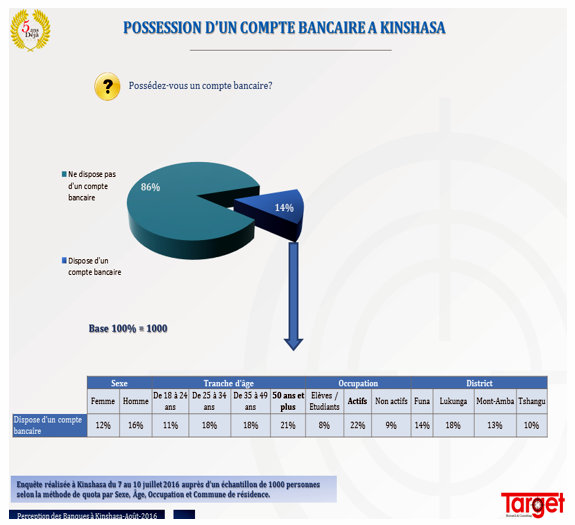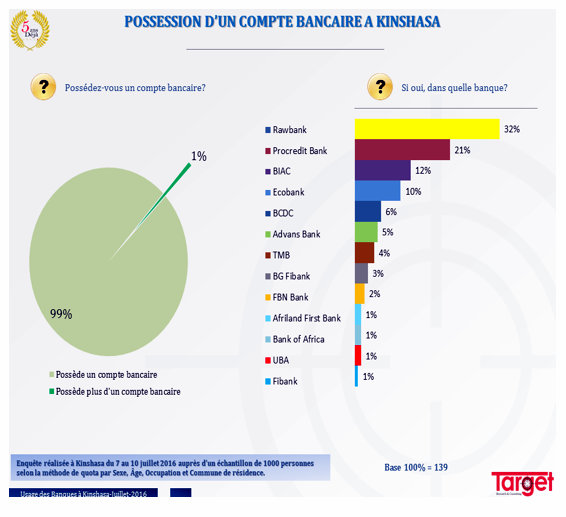 C’est donc dans un contexte de pleine reprise d’activités bancaires, malgré les difficultés actuelles de la BIAC (3e banque du pays) que l’étude de Target prend tout son sens. Les répondants ont-ils des comptes bancaires? Dans quelles banques ? Quelles opinions ont-ils des banques exerçant en RDC ? Quelle est la banque perçue comme la plus crédible ?