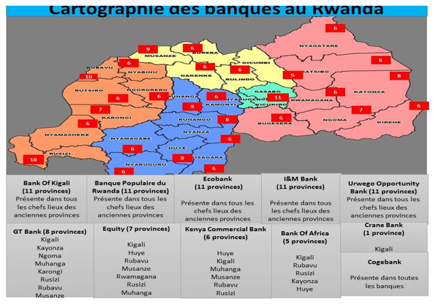 Les plus récentes de toutes ces banques sont la GT Bank et la Crane Bank qui sont arrivées au Rwanda en 2014. Six banques sur 11 sont présentes sut toute l’étendue du Rwanda alors que la Crane Bank est la banque la moins implantée sur le territoire rwandais. Ecobank semble avoir les frais de retrait le plus cher du Rwanda, 2% sur chaque retrait alors que Bank of Africa, Bank of Kigali, Banque Populaire du Rwanda, I&M Bank et Urwego Opportunity n’exigent aucun frais de retrait.