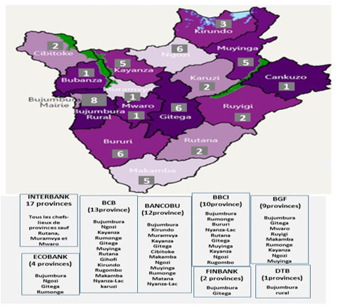 - Interbank. Cette dernière est présente dans tous les chefs-lieux de provinces à l’exception de Rutana, Muramvya et Mwaro