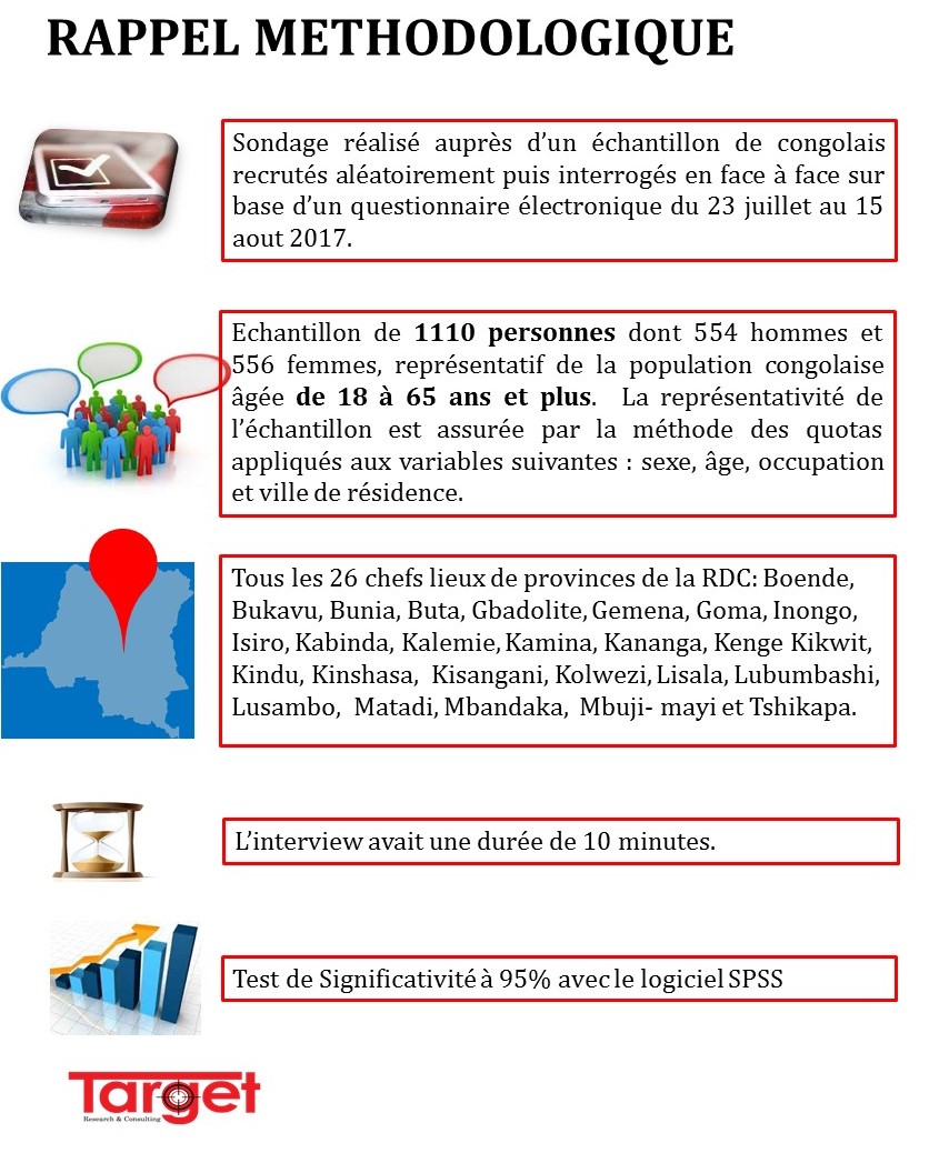 Quelles sont les principales préoccupations des Congolais? Quelles sont les attentes de la population congolaise à l’égard du Gouvernement? C’est pour apporter des éléments de réponse à ces questions que le cabinet d’études des marchés, Sondages d’opinion et conseil en Marketing, TARGET présente cette publication dédiée aux gouvernants, aux Organisations Non-Gouvernementales, aux Bailleurs de fonds qui soutiennent la République Démocratique du Congo ainsi qu’aux chercheurs. Cet outil aidera surement les uns et les autres à appréhender ce qui doit être fait en priorité pour répondre véritablement aux attentes de la population congolaise.