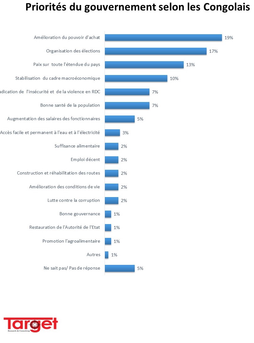 Vous pouvez acquérir directement en ligne les résultats détaillés des principales préoccupations du gouvernement ainsi que les priorités du gouvernement selon les Congolais par provinces et par catégories (Sexe, Tranche d’âge, Occupation et Revenu) en cliquant sur www.target-sarl.com