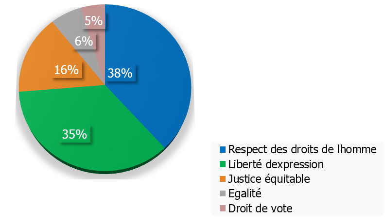 1. Selon la grande majorité des Congolais interrogés, la démocratie égale au respect des droits de l’homme et à la liberté d’expression. Pour 38% des personnes interrogées, la démocratie va de pair avec le respect des droits de l’homme alors que 35% évoquent la liberté d’expression. Globalement, les femmes (38%) lient le concept de démocratie à la liberté d’expression tandis que les hommes interrogés ont plutôt penchés (39%) pour les droits de l’homme. Faits intéressants à relever dans cette étude, moins de 10% des sondés lient la démocratie aux notions d’égalité et de droit de vote.