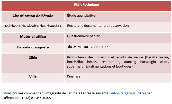 Au-delà de la présentation des marques des boissons disponibles dans les différents points de vente, cette étude dresse aussi un inventaire des prix pour chaque type de boisson et selon les points de vente. L’étude présente également un répertoire de toutes les entreprises qui desservent le marché kinois en boisson. Les données que présente cette étude sont d’une importance capitale tant pour les producteurs que les vendeurs des boissons.