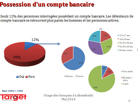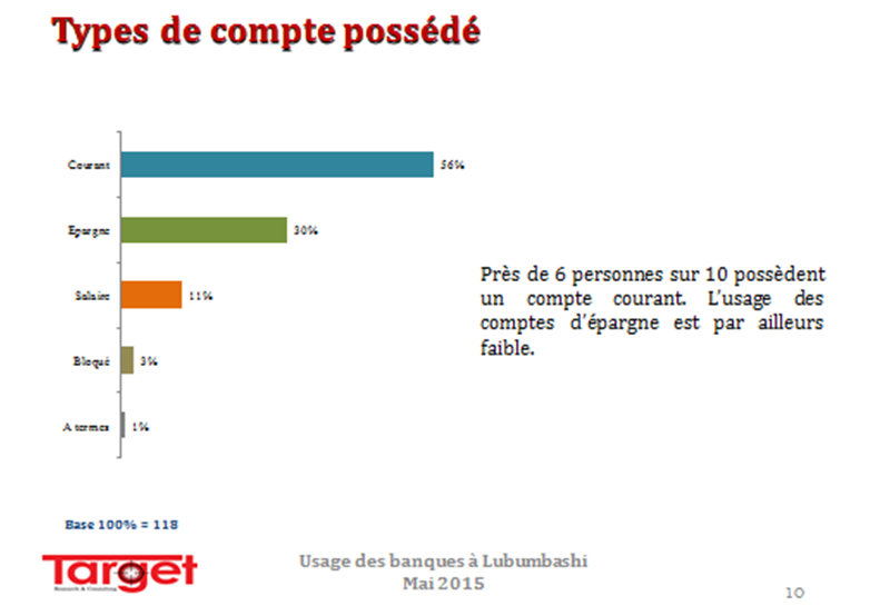 Cette étude se fixe ainsi comme objectif d’évaluer le taux de possession des comptes bancaires à Lubumbashi, de déterminer le types de comptes possédés et  l’usage du  mobile banking.