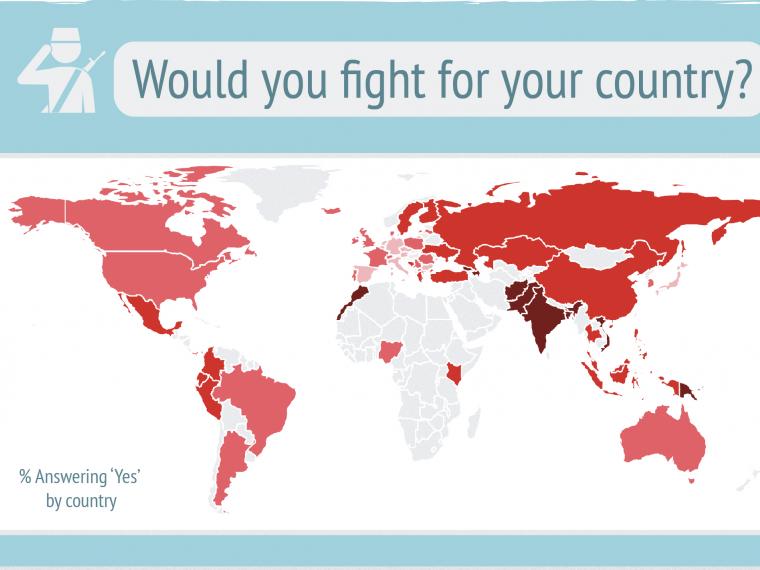 L’histoire récente des conflits dans différentes régions du monde offre un tableau de comparaison intéressant. Les Japonais (11%) et les Allemands (13%) par exemple sont peu enclins à se battre pour leurs pays alors que ce chiffre atteint plus du double pour le Royaume Uni (27%) et la France (29%).