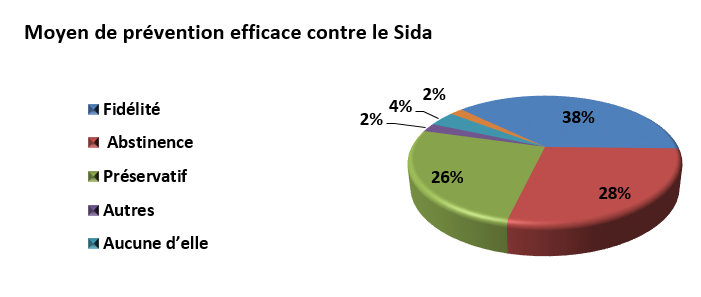 En termes des moyens de prévention, la fidélité représente pour 38% des personnes le moyen de prévention le plus efficace. Elle est suivie de l’abstinence 28% et l’usage de préservatifs (26%).